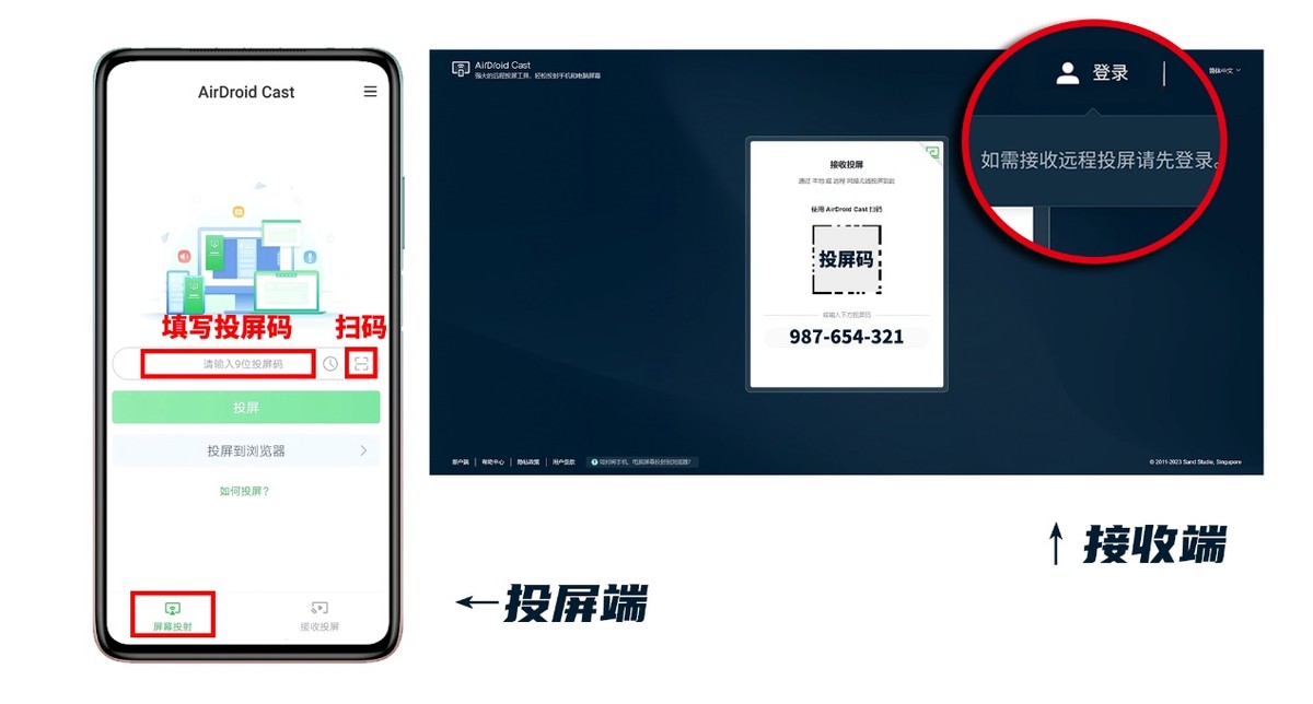 如果需要遠程投屏,那么在投屏前,請點擊AirDroid Cast手機端右上角,登錄高級賬號。如果只是本地近距離投屏,投屏前,將手機和電腦連接到相同的WiFi即可。