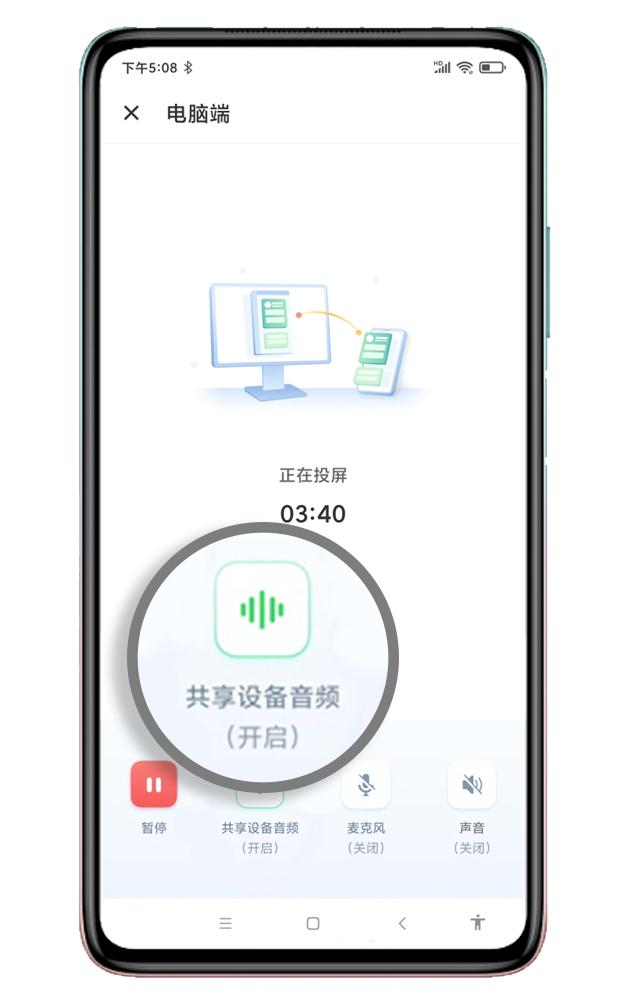 第三步,將電腦上的投屏碼填寫到手機,連接成功后,打開華為手機端AirDroid Cast里面的【共享設備音頻】按鈕。安卓10.0及以上版本的手機才有這個共享音頻功能。