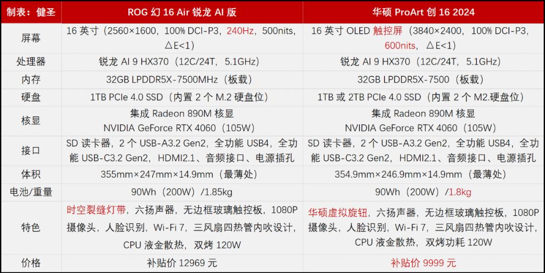 去年上市的ProArt創16 AI專業創作本,與R OG幻16 Air采用了共板設計,它們的三圍尺寸,接口數量布局,散熱模塊設計幾乎一模一樣,差別僅僅是外觀和屏幕規格而已。在首發上市時,創16的價格要高于幻16 Air,但隨著時間的推移,創16的價格經歷了大幅調價,從15999元直降到11999元,此時再疊加2000元的國補優惠,實際到手價僅9999元,比同配幻16 Air的補貼到手價便宜了3000元,性價比也因此顯露了出來。