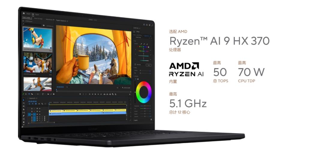 配置方面,創16 2024搭載AMD第三代AIPC處理器銳龍AI 9 HX370,采用4個Zen5和8個Zen 5c共計12核心24線程,最高加速頻率5.1GHz,內置36MB高速緩存,集成16個CU單元的Radeon 890M核顯,NPU算力50TOPS,CPU+GPU+NPU的整體AI算力高達80TOPS,可以用來釋放本地AI超能力,簡化語音轉錄文字、自動序列取景以及場景編輯檢測等流程,實現更高效的AI創作。