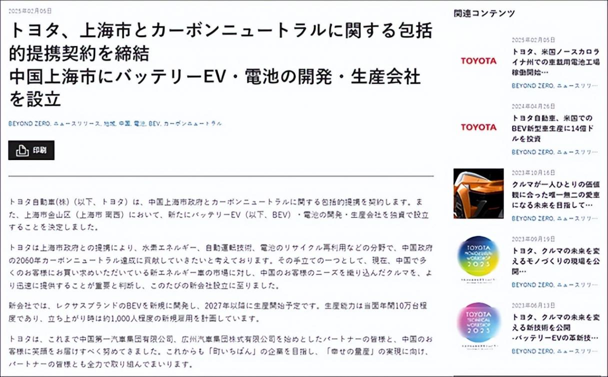 在“大豐田”體系內,2025年的第一個重磅消息,自然是雷克薩斯國產。2月,豐田正式宣布將在上海成立一家獨資企業,將從2027年開始在上海為其高端品牌雷克薩斯生產電動汽車,初期年產能約為10萬輛,并提供超過1000個職位。