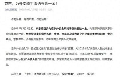 近日,京東外賣一系列舉措引發(fā)行業(yè)廣泛關(guān)注。2 月 11 日,京東開啟 “品質(zhì)堂食餐飲商家” 招募,宣布 5 月 1 日前入駐商家全年 0 傭金。2 月 19 日,官號(hào) “京東黑板報(bào)” 稱,3 月 11 日起將為全職騎手繳納五險(xiǎn)一金,為兼職騎手提供意外險(xiǎn)和健康醫(yī)療險(xiǎn)。京東外賣來勢(shì)洶洶,但其能否在競(jìng)爭(zhēng)激烈的外賣市場(chǎng)中闖出一片天,備受各界矚目。