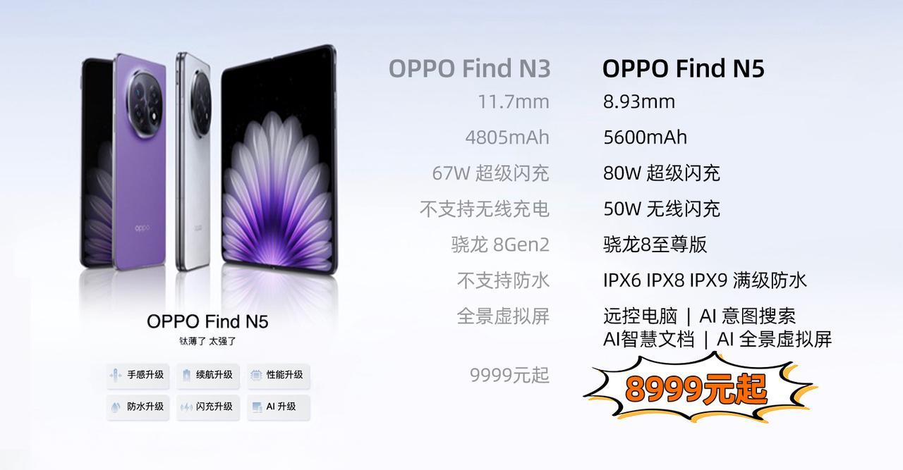 外觀方面,OPPO Find N5直接打破折疊屏機厚度的極限,將機身控制在8.93mm,帶領折疊旗艦進入8毫米時代。此外,Find N5還進一步升級了鈦合金天穹鉸鏈和3D打印技術,能夠在給手機減負的同時帶來更加耐用的體驗。