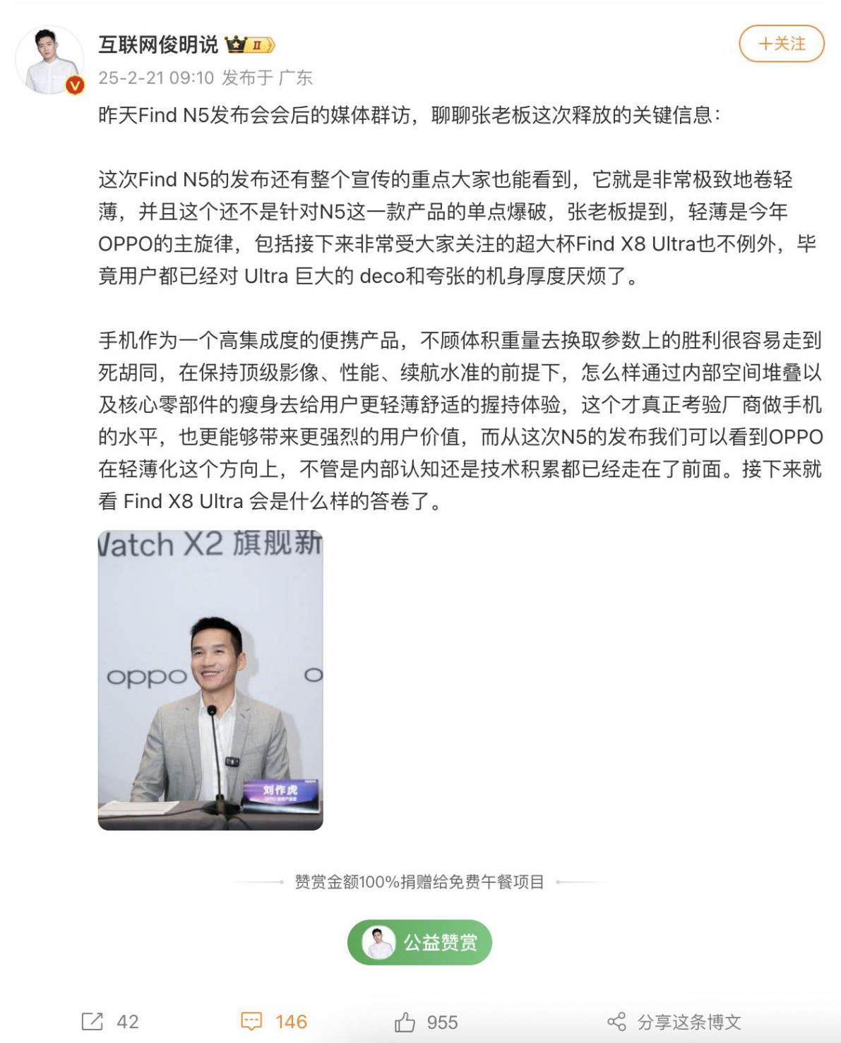 好消息是,未來的OPPO依舊發力不斷。根據OPPO高管的消息,未來的OPPO Find X8 Ultra也會延續輕薄的主旋律,通過內部空間堆疊和核心零部件的瘦身來給用戶帶去輕薄舒適的握持體驗。