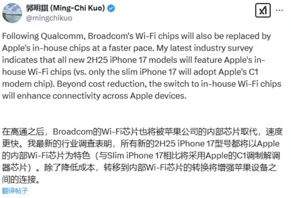 需要了解,博通作為蘋果Wi-Fi芯片的主要供應商,其產品覆蓋從iPhone 12到iPhone 16的全系列機型。