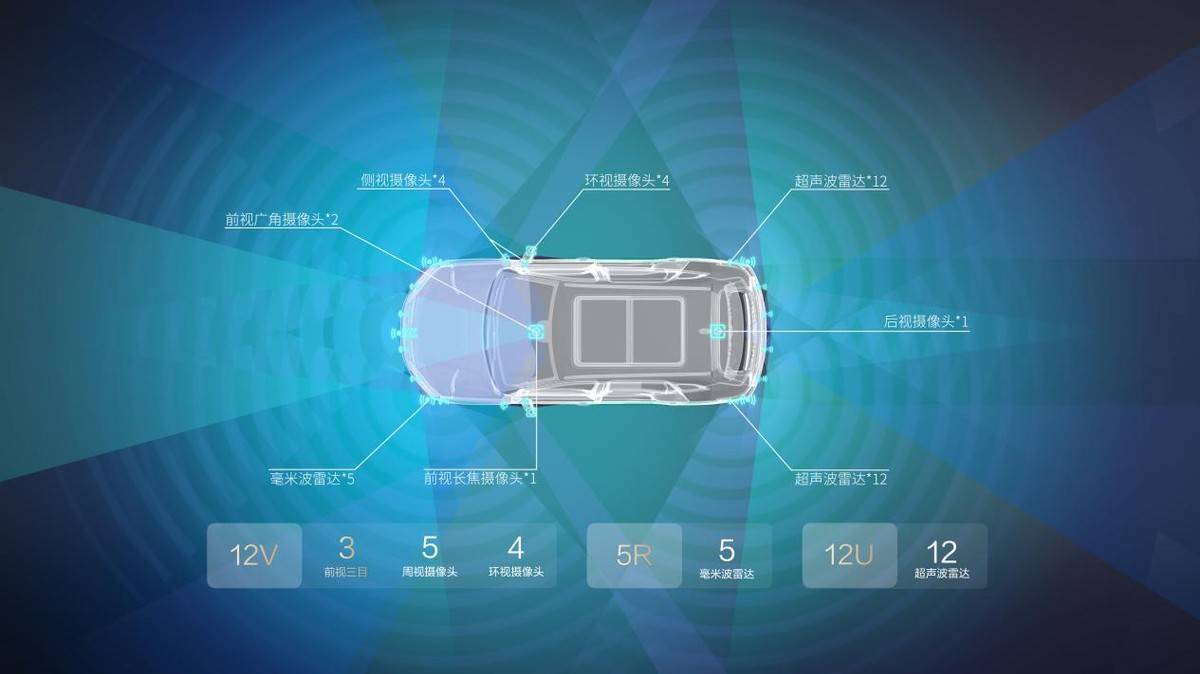 說到天神之眼C,不得不提它的“黑科技”,全棧自研、全球首創的前視三目5R12V12U方案,傳感器數量高達29個。在前視部分,天神之眼 C獨創的“二郎神”前視三目,由兩顆120°的廣角攝像頭、一顆30°的長焦攝像頭組成,均為800萬像素。這種設計,不僅感知距離更遠、更精準,還能生成高稠密點云,效果堪比激光雷達。