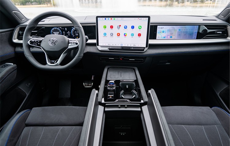 內飾部分采用大眾品牌最新的家族化設計,向全新途觀L Pro、帕薩特Pro看齊,中控臺上配備10.3英寸內嵌式液晶儀表盤、15英寸懸浮式中控屏、11.6英寸副駕駛娛樂屏,方向盤采用三輻式平底構造,使用電子懷擋式換擋機構,中央通道前方提供手機無線充電面板,后方為內置屏幕的旋鈕按鍵、縱向雙杯架。
