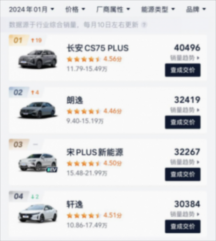 在1月的銷量排名中,讓人比較意外的當然就是排名第一的長安CS75 PLUS了,40496的銷量,相比去年12月份有著18624臺的提升,增幅超85%,使其成為全車型銷量冠軍,超越軒逸朗逸,問界M7等強大對手,這也是該車型歷史性地拿下銷量冠軍的頭銜,展現出強勢的姿態(tài)。