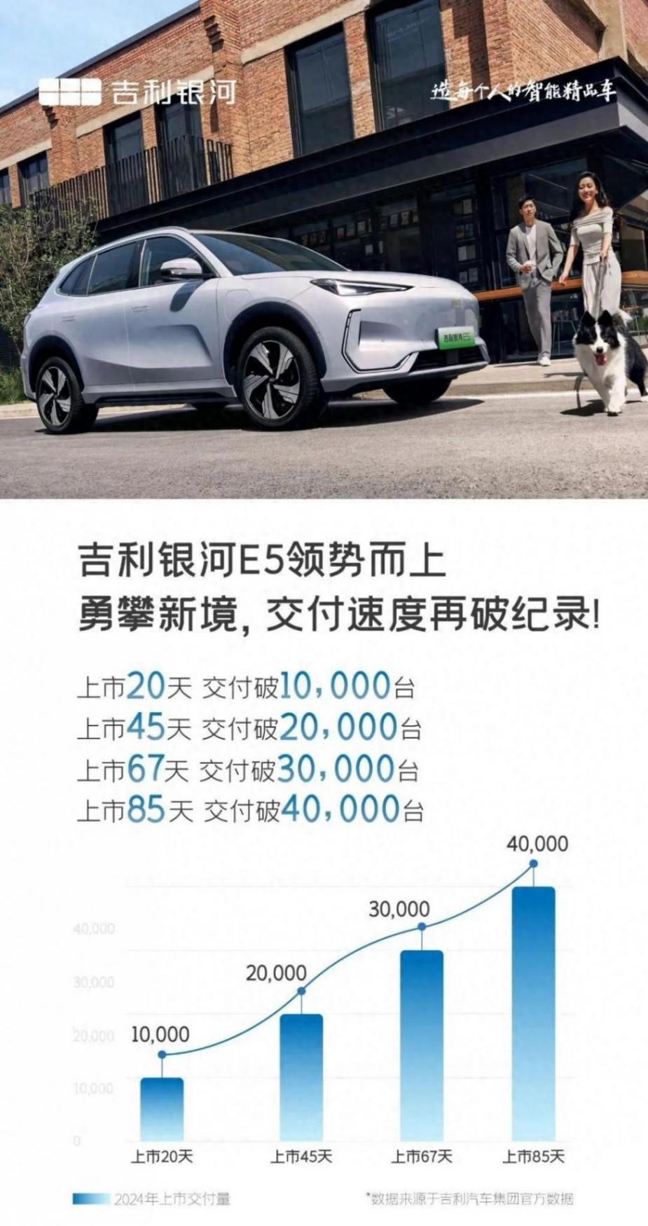 至于銀河E5,更是被譽(yù)為“紀(jì)錄收割機(jī)”,上市20天交付量破萬(wàn),45天破兩萬(wàn),67天破3萬(wàn),到了上市第85天,直接突破4萬(wàn)。