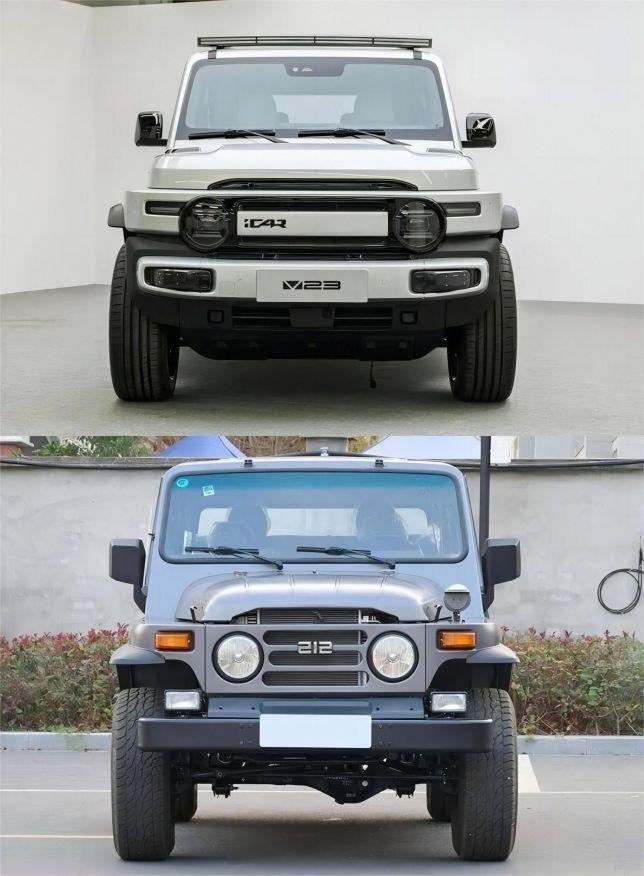 新車依舊采用方盒子造型,并且相比iCAR 03其外觀設計更為富有個性。前臉采用雙圓燈造型,周圍一圈黑色的橢圓輪廓。明顯致敬了經典的越野車型212,復古與新潮相結合。