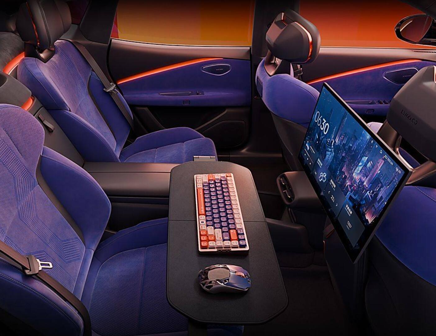 內部,有兩種配色可選。采用12.66英寸液晶儀表+15.4英寸中控屏+17英寸后排娛樂屏+25.6英寸抬頭顯示,同時配備了AMD V2000A桌面芯片和AMD RX6600M獨立顯卡,以及24g內存、1T固態硬盤、水冷扇熱,后排屏幕可以運行Windows辦公軟件。此外,還配備了真皮方向盤、50w無線充電、256色氛圍燈、熱泵空調等。