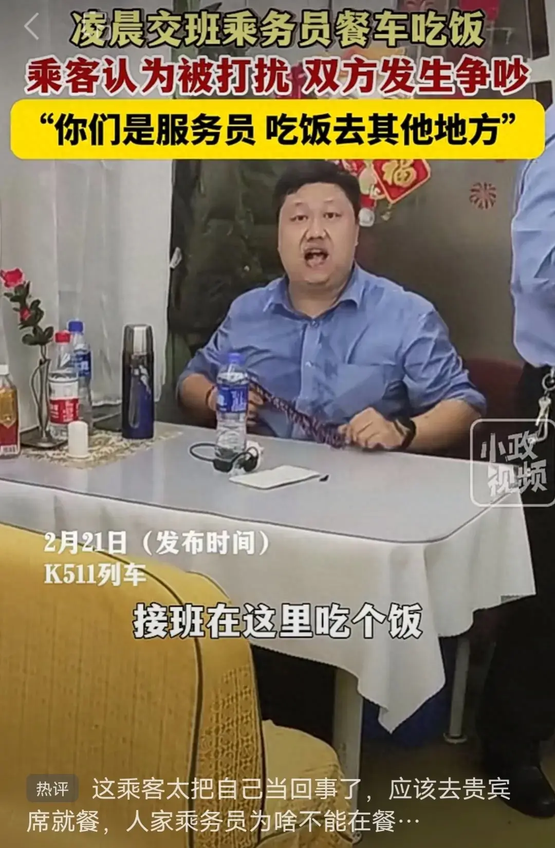 事發(fā)2月22日K511次列車上,乘務(wù)員凌晨換班,在餐車一餐桌吃飯,而餐車上還有多名乘客在就餐,其中一名乘客就認(rèn)為乘務(wù)員在餐車就餐打擾了他們。