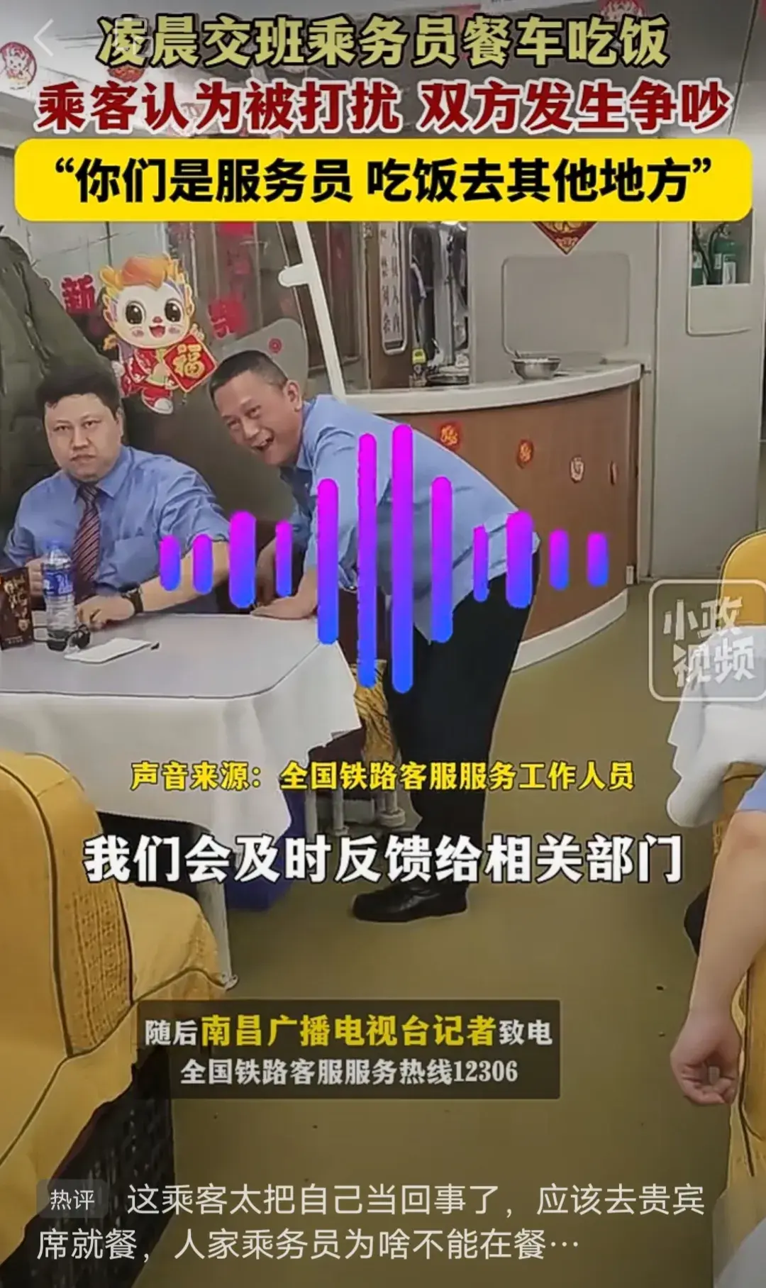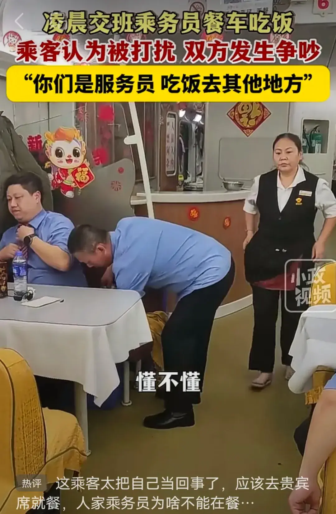 乘務(wù)員凌晨換班在餐車吃飯,卻遭到同在餐車的乘客不滿,聲稱這里是乘客用餐的地方,你們是服務(wù)員,吃飯去其他地方。