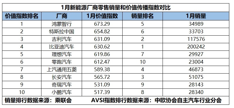 銷量之外,品牌傳播的角力同樣激烈。根據(jù)2025年1月新能源廠商價值傳播指數(shù)(AVSI)顯示,鴻蒙智行以673.29的指數(shù)登頂。其成功除了產(chǎn)品在設(shè)計、豪華、智能化等方面的持續(xù)熱度以外,品牌知名度與傳播度讓其首次入榜即沖到榜首,且在銷量和價值傳播指數(shù)排行中均超越了特斯拉,可見其后發(fā)優(yōu)勢及合力、借力的打法頗具成效。
