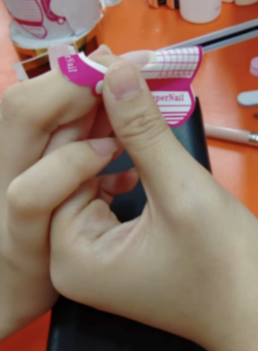 甲片一般用塑料制成,用膠水粘貼于本甲上,有全貼和半貼兩種方式。全貼是甲片覆蓋了整個指甲,而半貼則是甲片底部貼于指甲中部,并將交接處打磨平整,顯得更加自然、有層次感。