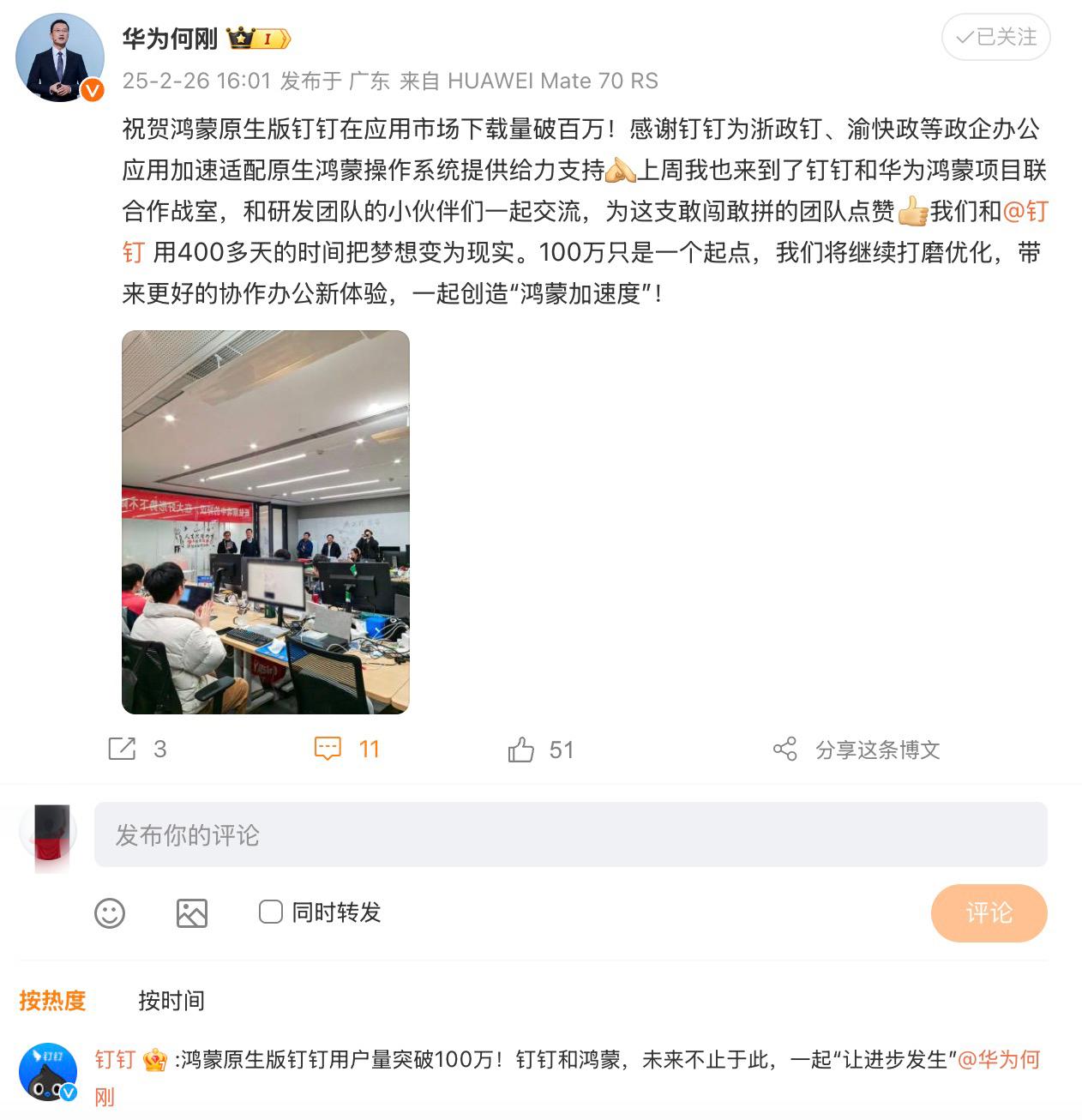 值得一提的是,今天下午華為何剛在微博上祝賀釘釘下載量破百萬(wàn),并表示這只是一個(gè)起點(diǎn),未來(lái)會(huì)繼續(xù)打磨優(yōu)化,帶來(lái)更好的協(xié)作辦公新體驗(yàn),一起創(chuàng)造“鴻蒙加速度”。釘釘也熱情回應(yīng):釘釘和鴻蒙,未來(lái)不止于此,一起“讓進(jìn)步發(fā)生”! 這波雙向奔赴的互動(dòng)讓許多網(wǎng)友表示“磕到了”,也更期待兩家聯(lián)手能給用戶帶來(lái)更多新驚喜。