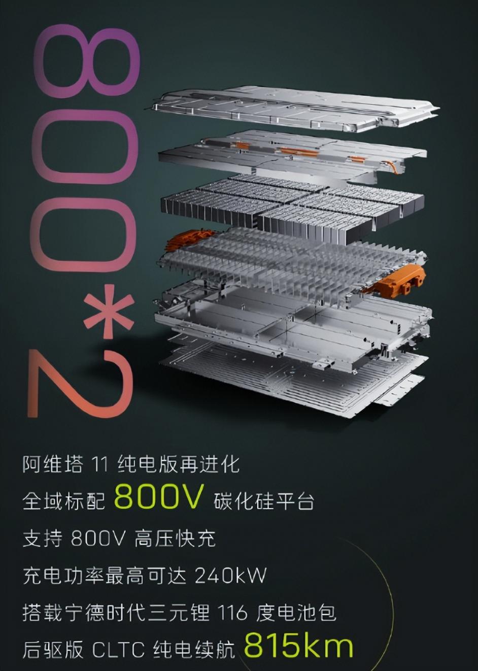 純電版車(chē)型這邊,新款阿維塔11跟12車(chē)型一樣,換裝了最新的華為驅(qū)動(dòng)電機(jī),功率從230kW提升至237kW;四驅(qū)車(chē)型上,阿維塔11搭載雙電機(jī)系統(tǒng),綜合功率402kW,總扭矩達(dá)到了687N·m,0-100km/h加速時(shí)間為3.9秒。電池方面,新款阿維塔11純電版車(chē)型還是用了寧德時(shí)代三元鋰電池,最大容量為116kWh,最大CLTC純電續(xù)航里程為815km。
