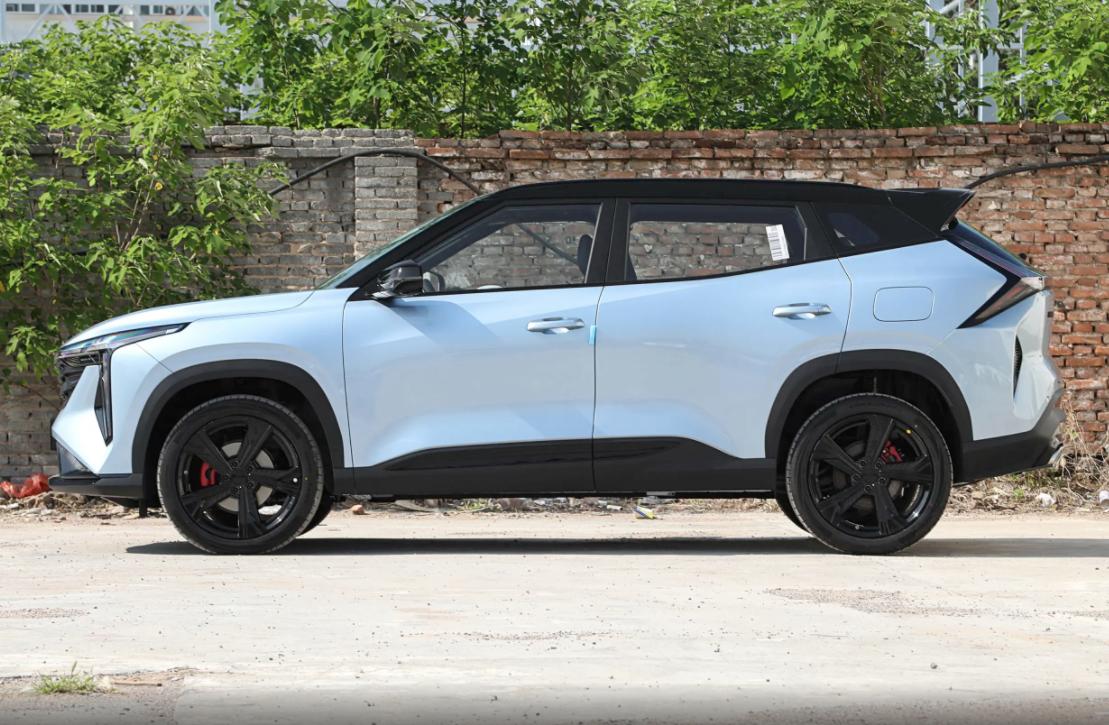 而來到車側,可以看到吉利博越采用了至少三條腰線的設計,以至于讓車側看起來富有層次感,同時也多了幾分力量感。另外還可以看到,吉利博越針對其A/B/C柱進行了熏黑處理,配合上熏黑的外后視鏡,以及類似轎跑SUV的車身姿態,同樣可以提高整車的運動氣息。