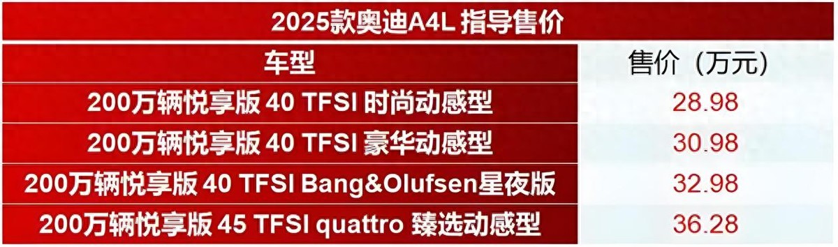 此次上市的2025款奧迪A4L共推出了4款車型,指導價區間為28.98-36.28萬元。與2024款車型相比,入門價格下調了3.2萬元,這無疑為消費者帶來了更大的購車優惠。奧迪此次的價格調整,不僅是對市場需求的積極響應,更是對消費者需求的深刻洞察。這樣的價格策略,使得2025款奧迪A4L在豪華B級車市場中更具競爭力,成為性價比之選。