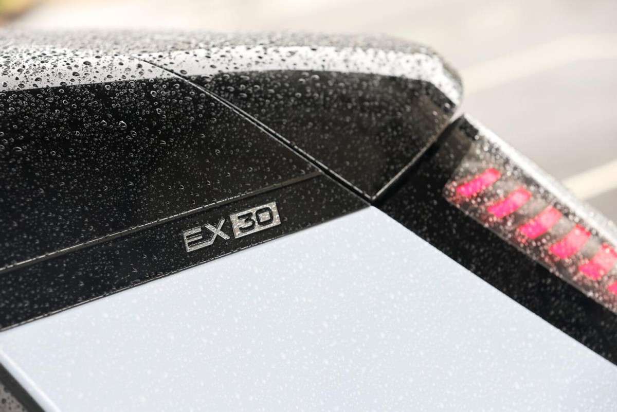 黑色車頂后方兩側(cè)鑲嵌有EX30專屬銘牌以標(biāo)示身份。