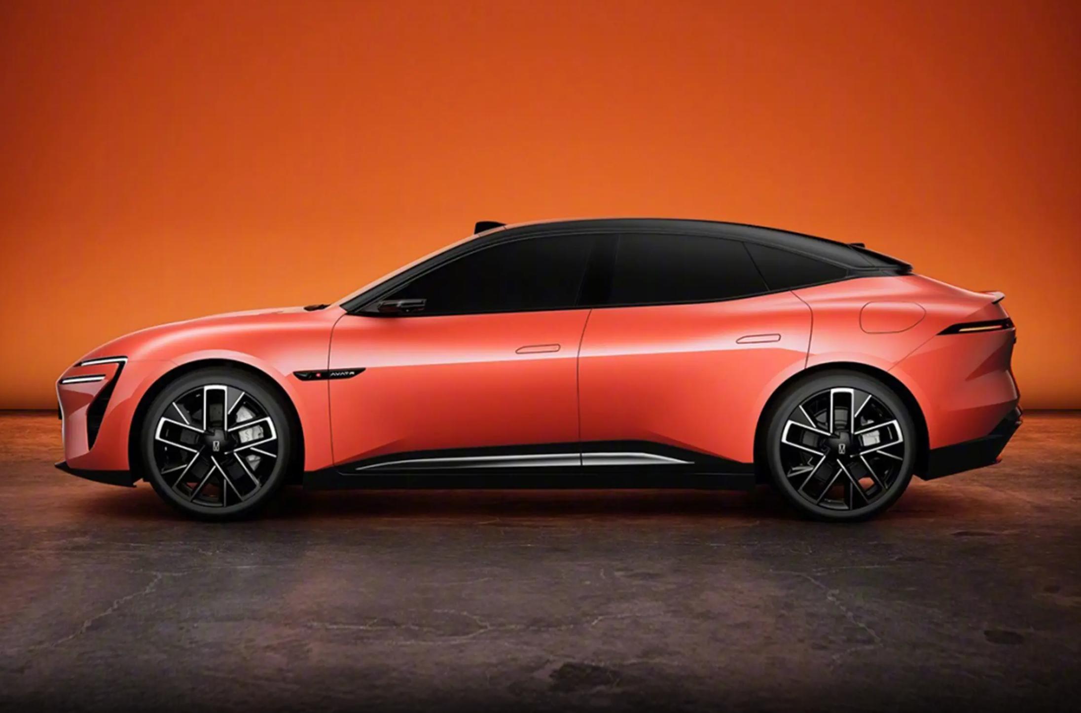 車身側(cè)面,阿維塔06采用溜背式車身結(jié)構(gòu),流暢的線條勾勒出飽滿的車身造型,搭配上雙拼的車身配色以及大尺寸的五幅式運(yùn)動(dòng)輪轂,視覺效果極其出眾。