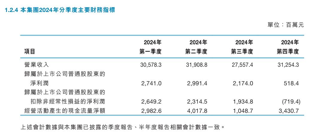 分季度看,中興通訊2024年第一、第二、第三、第四季度歸屬于上市公司普通股股東的凈利潤分別為27.41億元、29.91億元、21.74億元、5.18億元。另外,該公司第四季度扣非凈利虧損7.19億元。
