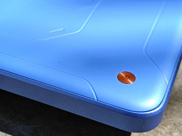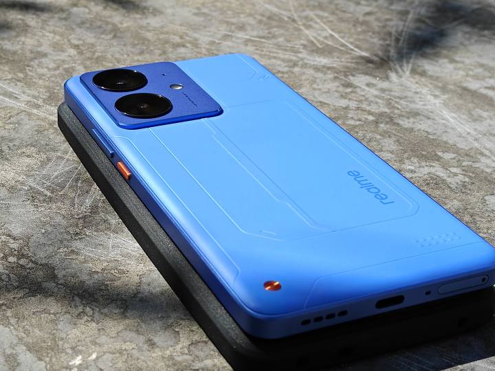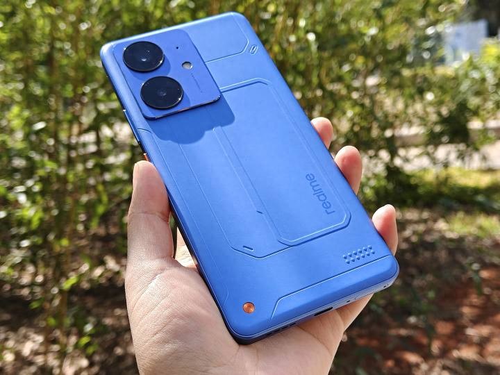 真我Neo7 SE提供了三種配色:白翼戰神、蒼藍機甲和暗鎧鐵騎。我們拿到的是蒼藍機甲版本,藍色涂裝+硬朗線條,背板左下角的“信念之釘”設計,瞬間讓整機有了機甲戰士的既視感。