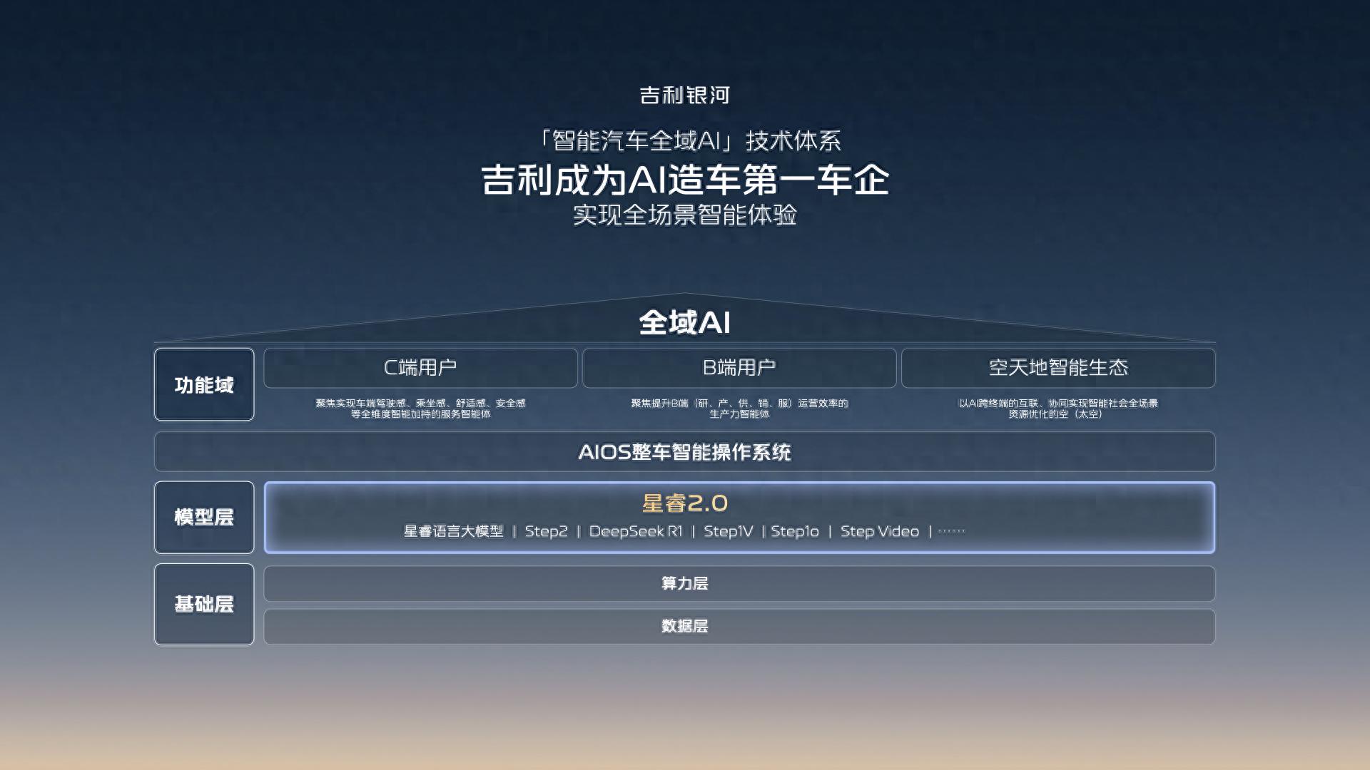 以吉利為代表的中國汽車領軍品牌,正積極培育以AI為核心的新質生產力。吉利汽車是全球唯一完成全域AI智能化布局的車企,不僅將AI技術深度應用于架構、動力、底盤、座艙等智能汽車全領域,還將AI貫穿于產品研發、生產、售后服務等全鏈路環節,實現全場景智能體驗。在AI核心的算力、算法和數據方面,吉利匯聚了強大的“三駕馬車”。