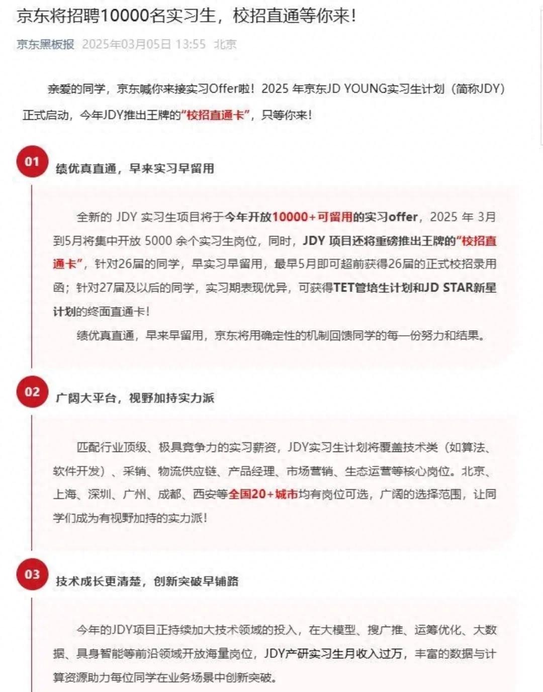凌晨1點(diǎn)27分,北京亦莊京東總部大樓燈火通明。當(dāng)2025屆畢業(yè)生還在為春招焦慮時(shí),京東突然拋出震撼彈——JD YOUNG實(shí)習(xí)生計(jì)劃攜10000+留用崗位空降!更讓全網(wǎng)沸騰的是:算法崗實(shí)習(xí)生月薪直接飆到五位數(shù),優(yōu)秀者還能"免試直通"校招終面!網(wǎng)友驚呼:"這哪是實(shí)習(xí),分明是就業(yè)直通車!"