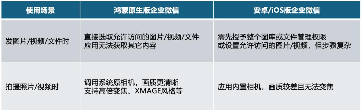 除了原有功能外,鴻蒙原生版企業(yè)微信還帶來了一些創(chuàng)新功能,在使用體驗(yàn)上甚至超越了安卓和iOS版本。比如,在安卓和iOS版本上發(fā)送圖片、視頻或文件時(shí),需要授予應(yīng)用訪問整個(gè)圖庫或文件管理的權(quán)限,這無疑增加了隱私泄露的風(fēng)險(xiǎn)。而在鴻蒙原生版企業(yè)微信上,得益于HarmonyOS NEXT的全新安全訪問機(jī)制,應(yīng)用只能訪問你授權(quán)的數(shù)據(jù),真正做到“隱私安全,由你掌控”。