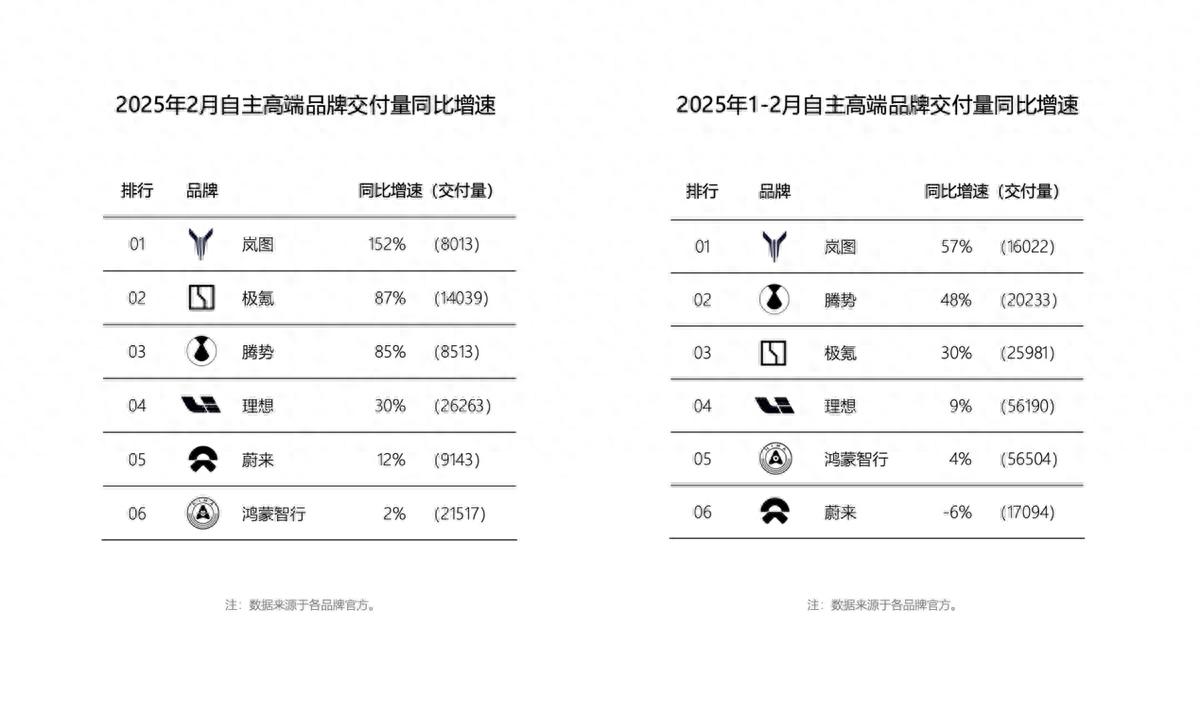 隨著塔界、尚界、示界陸續曝光,市場“含華量”競爭再升級,今年2月,“含華量”車型依舊呈熱銷態勢霸榜。新M7系列2月交付5204輛,憑借華為HarmonyOS智能座艙的極致交互體驗和增程式動力的續航優勢,再創中國新能源豪華品牌新紀錄;智界R7開年至今熱銷依舊,2月交付8748輛。除搶眼的“各界"外,同樣與華為合作的嵐圖汽車,官方發布2月交付新車8013輛,同比大漲152%,位列自主高端增速第一。“含華量”正成為影響新能源汽車銷量的重要因素。