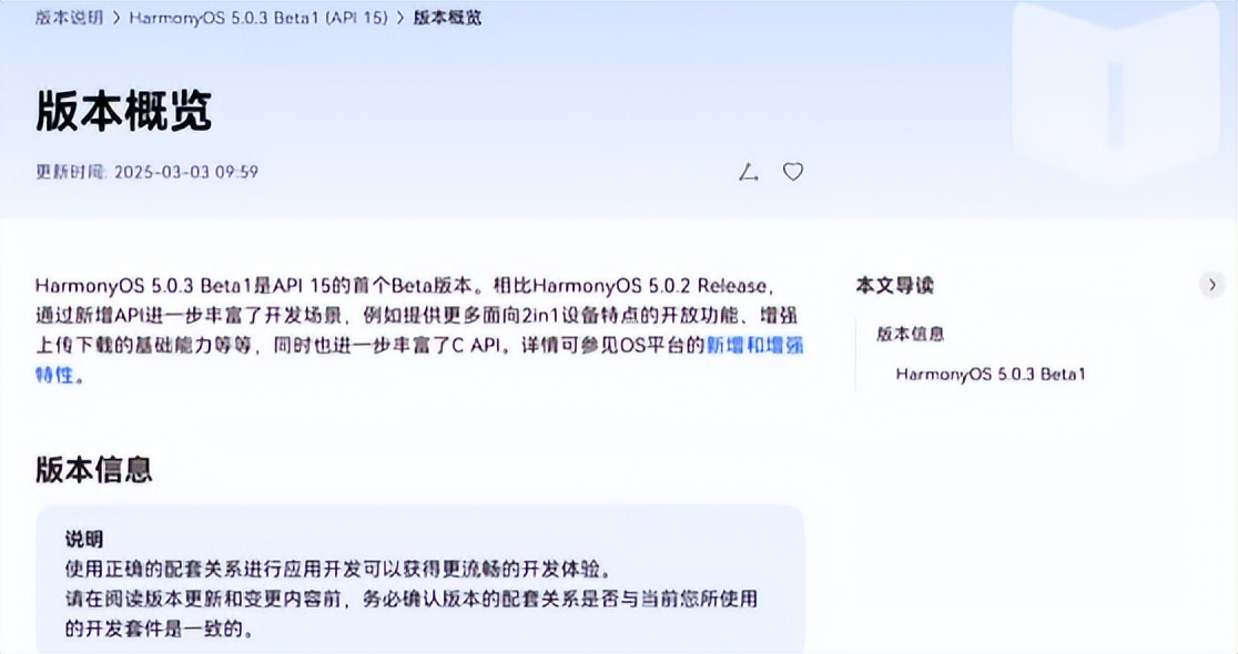 然而,細(xì)心的用戶可能會(huì)注意到,盡管這次更新帶來了諸多新功能和優(yōu)化,但API版本仍然停留在14而未升級(jí)至15。根據(jù)華為開發(fā)者官網(wǎng)的最新信息,HarmonyOS 5.0.3 Beta1已經(jīng)開始測(cè)試API 15。