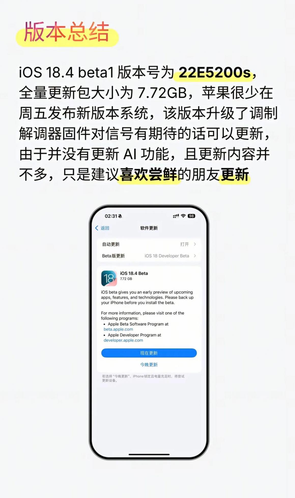 期網上瘋傳的iOS18.4系統版本即將發布升級,更新了許多實用的功能,但用戶面對眾多版本更完后的后遺癥,遲遲鐘鼓初長夜,擔心更新完掉電快,易卡頓,易發燙的種種問題出現,那么蘋果的iOS 18.4究竟值不值得更新呢?下面正文為你解析!