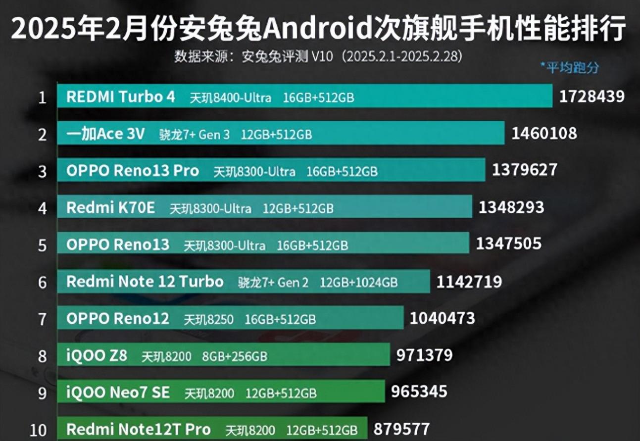 最后,在2025年2月份安兔兔安卓次旗艦手機性能排行榜中,OPPO Reno12和iQOO Z8分列第七名和第八名。在安兔兔平臺上,這兩款智能手機的平均跑分分別為1040473分和971379分。在此之后,iQOO Neo7 SE和Redmi Note12T Pro分列第九名和第十名。在安兔兔平臺上,這兩款智能手機的平均跑分分別為965345分和879577分。其中,iQOO Neo7 SE采用6.78英寸2D柔性直屏;配有電子藍、星際黑、銀河三種顏色;高度約為164.81毫米,寬度約為76.9毫米,厚度約為8.58毫米,重量約為193克。
