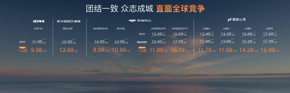 技術再強,買不起也是白搭,人人共享除了技術開源,還要讓人人都能買得起,奇瑞此次還帶來了讓用戶“薅羊毛”的一口價,旗下多個品牌集體放出“一口價”政策,包括風云系列、山海系列、iCAR品牌、星途等。