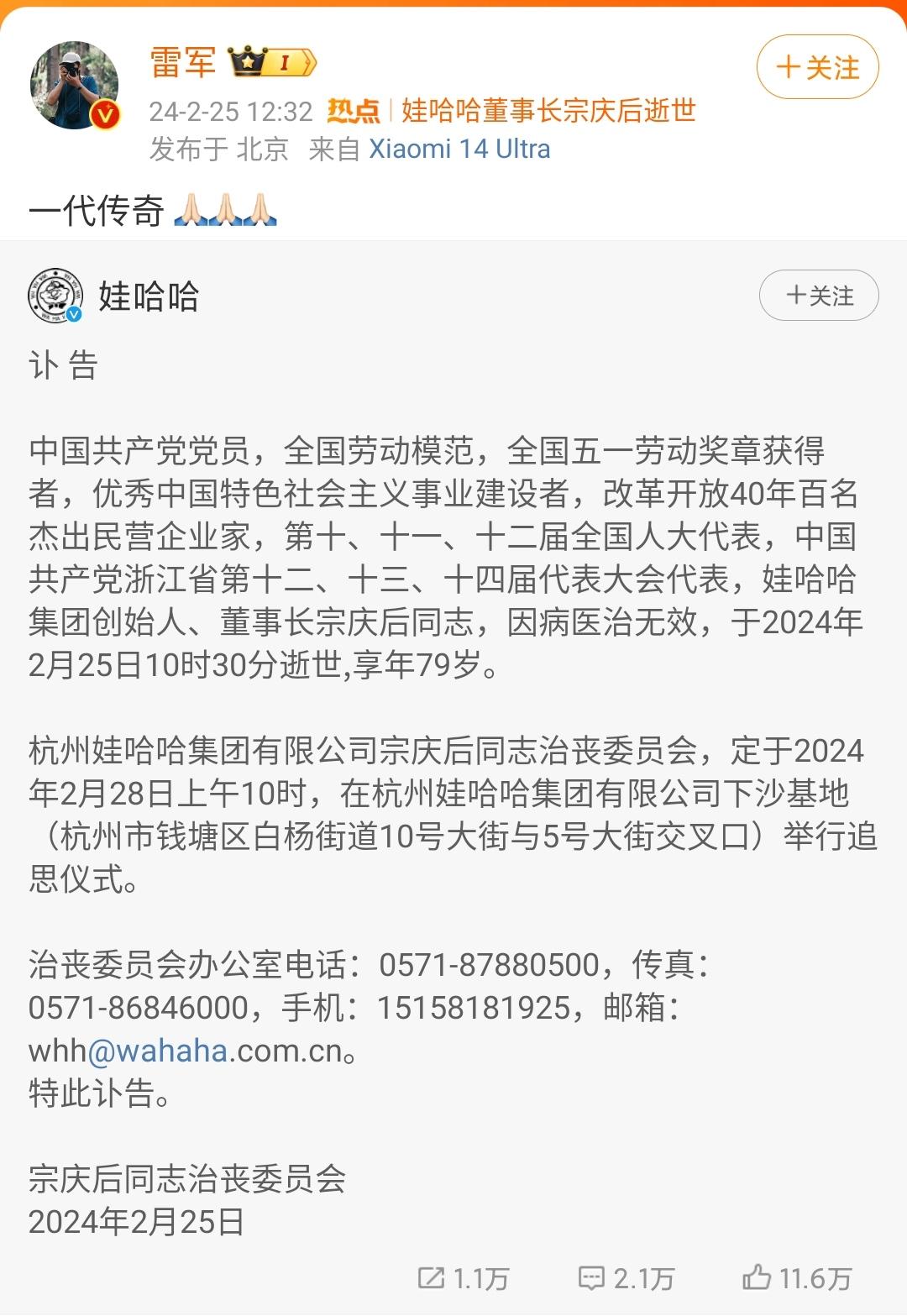 連小米創始人雷軍也不禁悼念宗慶后并感慨:“一代傳奇”。