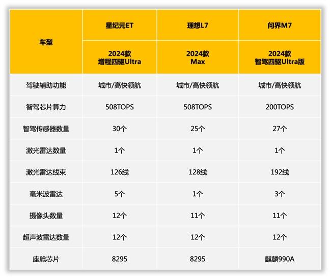 問界M7同樣展現(xiàn)出強大的實力。其搭載華為200TOPS算力的麒麟990A芯片,配備的192線激光雷達在三款車型中擁有最高的線束數(shù)量,同時還有3個毫米波雷達、11個高清攝像頭和12個超聲波雷達。這種高規(guī)格的硬件配置,使其在環(huán)境感知方面也具備很強的競爭力。