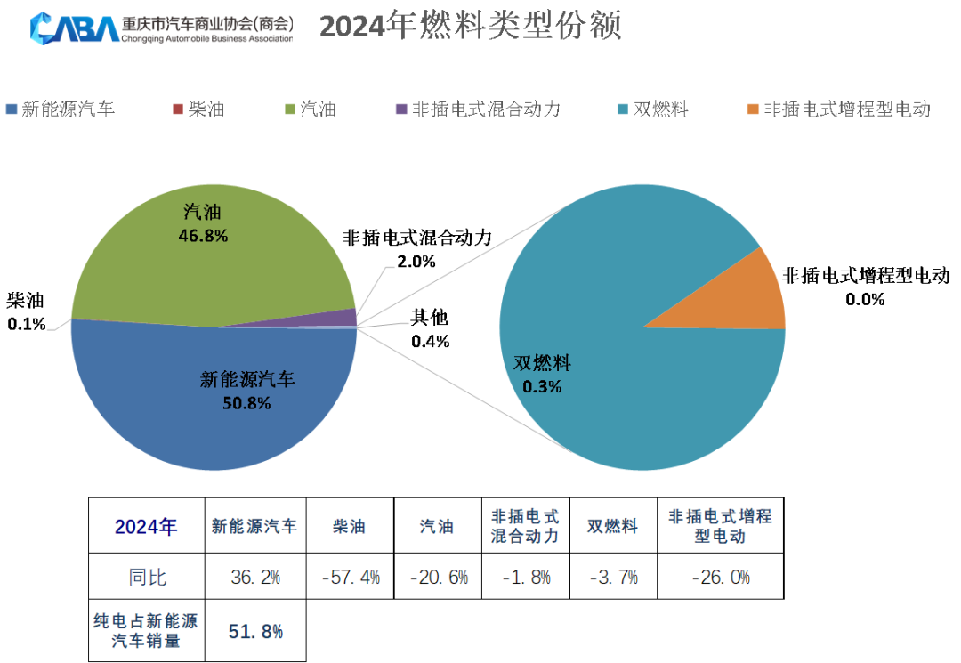 從2024年銷(xiāo)售車(chē)型的燃料類(lèi)型來(lái)看,重慶市場(chǎng)燃油車(chē)銷(xiāo)量占比為46.8%,新能源汽車(chē)銷(xiāo)量占比達(dá)到50.8%,其中純電車(chē)型占新能源汽車(chē)銷(xiāo)量的51.6%。