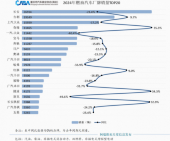 看完了重慶整體市場(chǎng)外,再了解一下重慶市場(chǎng)燃油車(chē)品牌銷(xiāo)量情況,會(huì)發(fā)現(xiàn)過(guò)去的2024年,自主品牌及車(chē)型表現(xiàn)比較平穩(wěn),而合資品牌及車(chē)型走勢(shì)低迷,市場(chǎng)依然嚴(yán)峻。