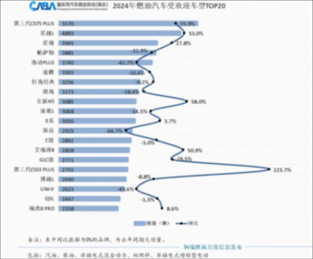 在重慶2024年燃油車(chē)的銷(xiāo)量排名中,第三代CS75PLUS、星越L、星瑞毫無(wú)懸念地居榜單前三,同比增長(zhǎng)分別為35.9%、53.0%、27.8%。看來(lái)在過(guò)去的2024年,自主燃油車(chē)憑借出色的產(chǎn)品依然吸引了不少追消費(fèi)者。