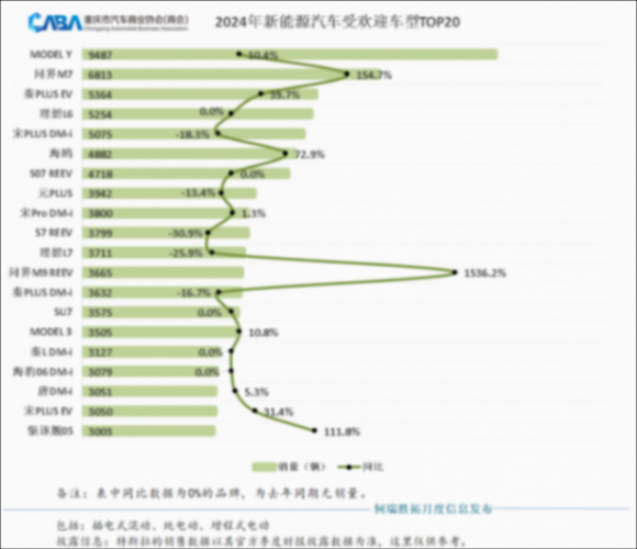 再看重慶市場(chǎng)2024年新能源車(chē)型銷(xiāo)量情況,MODEL Y、問(wèn)界M7、秦PLUS EV位居前三,銷(xiāo)量同比增長(zhǎng)分別為10.4%、154.7%、39.7%。其中問(wèn)界M7的增幅較大,從中可以感受到AITO在過(guò)去的一年堪稱(chēng)黑馬般的速度。