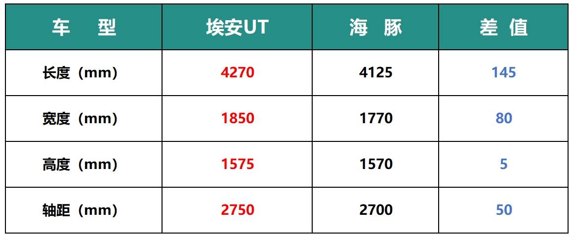 先看尺寸,同為小型電車,埃安UT的長寬高分別為4270*1850*1575毫米,軸距2750毫米,海豚的長寬高分別為4125*1770*1570毫米,軸距2700毫米,可以看到,埃安UT在尺寸上要占據明顯優勢,對比海豚,長度大了145毫米、寬度多了80毫米、高度增加了5毫米,軸距則是長了50毫米,在只有4米出頭的車型上,這樣的尺寸差距還是很明顯的。