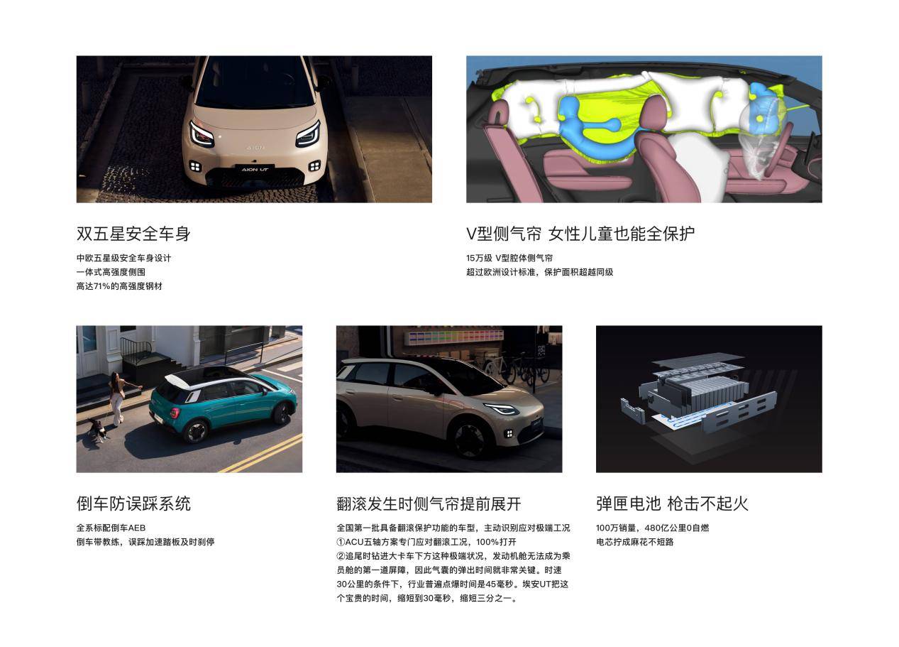 安全方面做的都挺到位,埃安UT采用中歐雙五星安全車身設計,高強度鋼的占比超過71%,采用一體式高強度側圍,搭載6安全氣囊,其中側氣簾是V型樣式,保護面積更大,對女性和兒童的保護更全面,超過了歐洲的設計標準,具備翻滾保護功能,主動識別應對極端工況,包括翻滾發生時側氣簾提前展開以及追尾時鉆進大貨車下方,時速30公里條件下,氣囊彈出時間縮短到30毫秒。全系標配倒車防誤踩系統,也就是倒車AEB,誤踩油門能及時剎停,彈匣電池槍擊不起火。主動安全方面配備車道偏離預警、主動剎車、前碰撞預警、道路呼叫救援等。