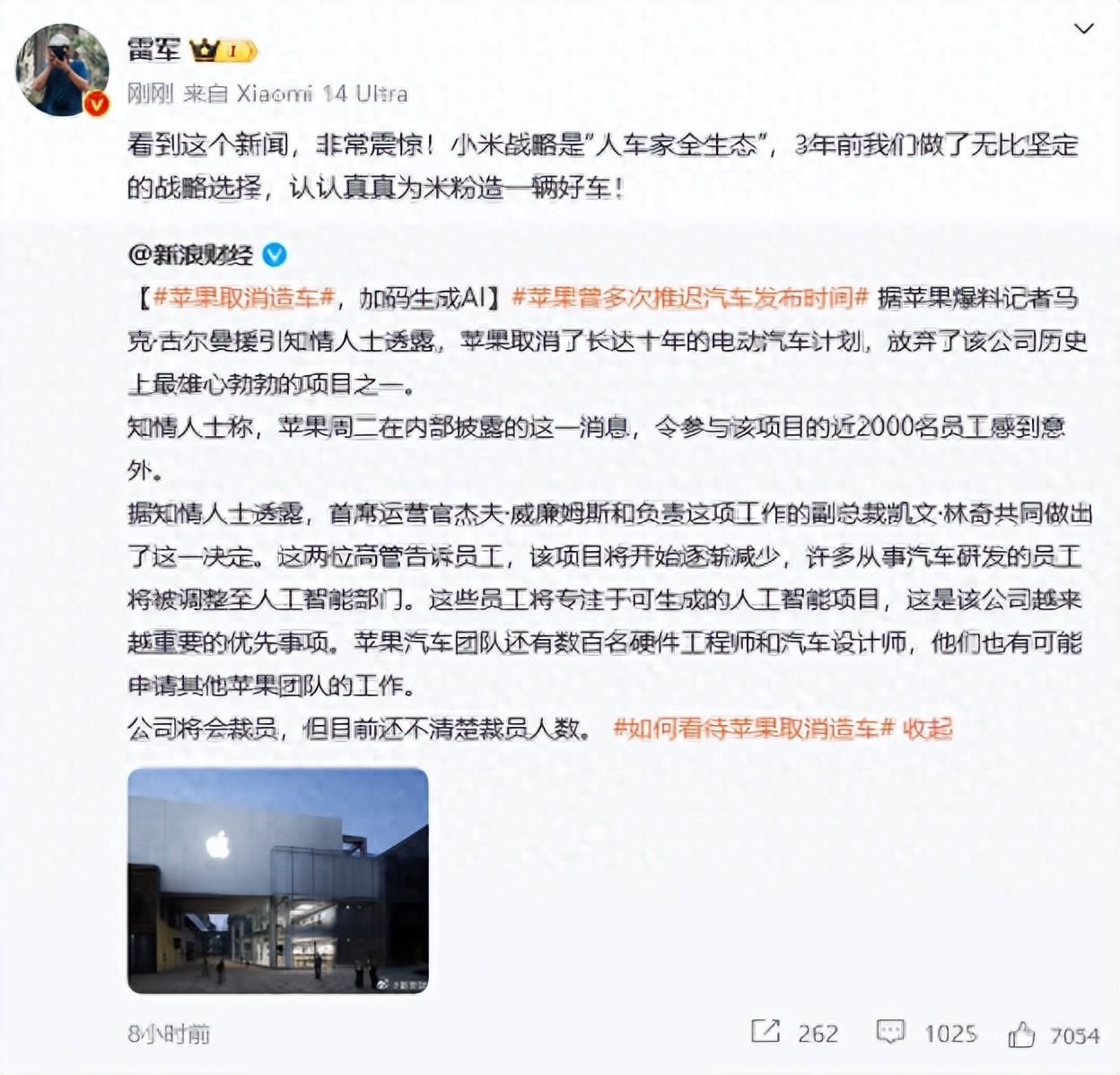 2月28日,雷軍轉發蘋果取消造車的新聞內容,直呼“非常震驚”。