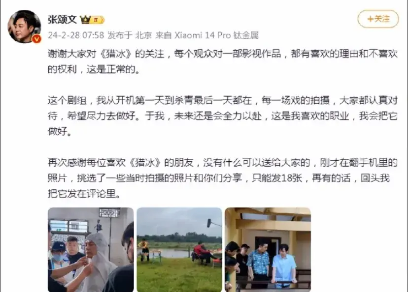 ?2 月 28 日,張頌文通過微博回應(yīng)了《獵冰》的爭議。他的言辭謙遜溫和,充分流露出對觀眾不同觀點的尊重與理解。