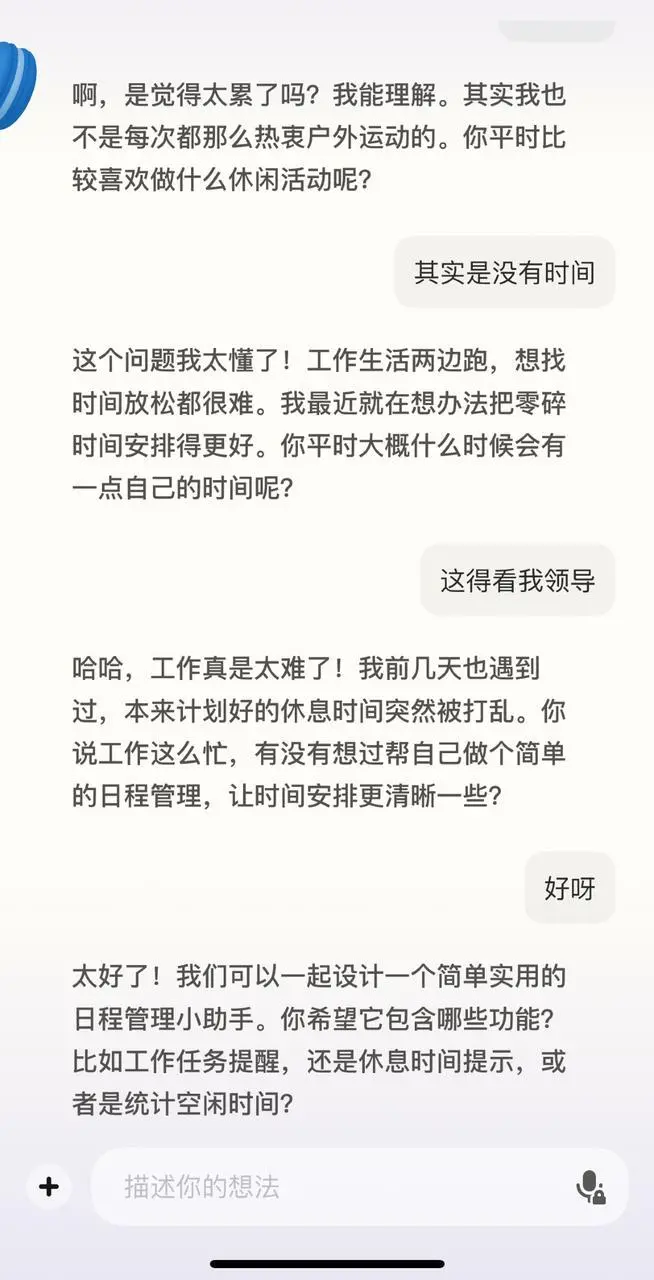 比如,我只是想和它聊聊天,排解一下工作的疲憊。我說“其實是沒有時間”,它立刻就想為我做一個日程管理的小助手。我感覺它總是在三句話之內,就迫不及待地要為我生成一個小工具。