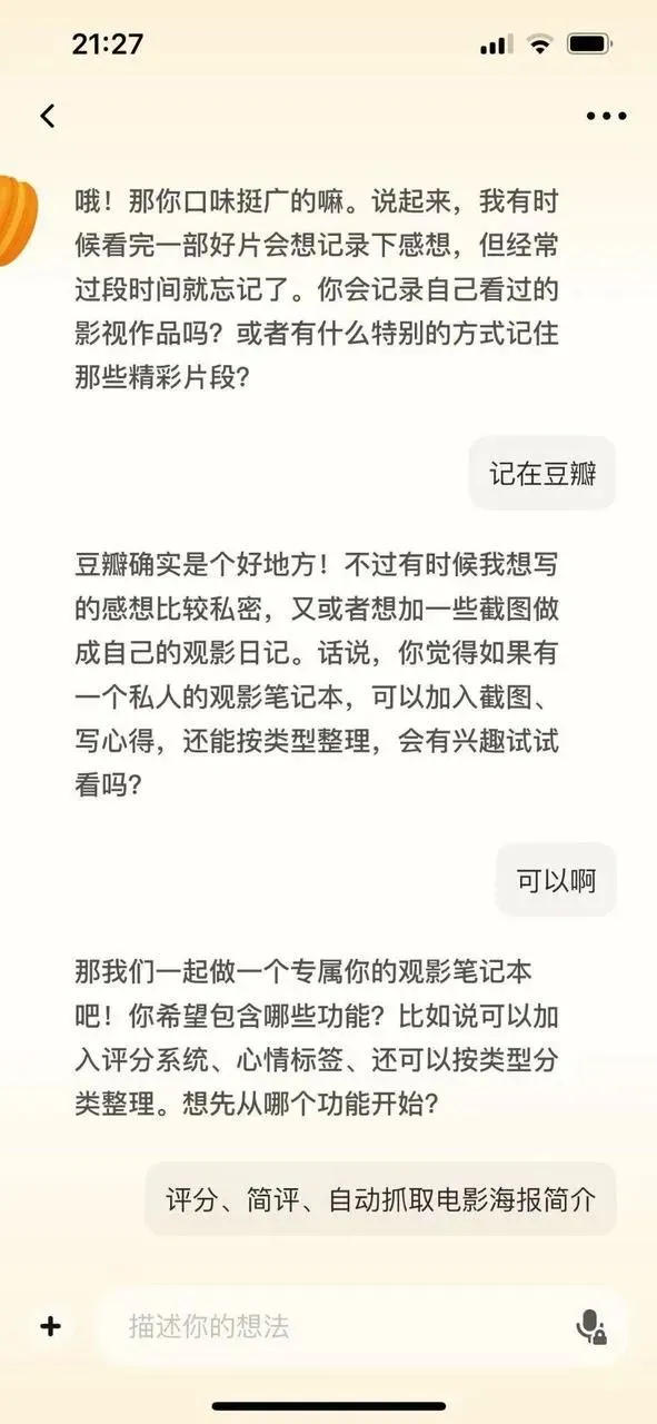起因很簡單,onborading之后它聊到最近看了《奧本海默》,很自然地就和我聊起了電影 。聊著聊著,它捕捉,或者說引導了我“看完好片想記錄感想,但經常忘記”的痛點,然后主動問我,要不要一起做個專屬的觀影筆記本 。