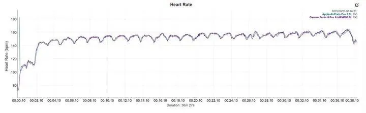 Nick Harris-Fry 以 Garmin HRM600 胸帶(電信號(hào)級(jí)精度)作為對(duì)照,結(jié)果發(fā)現(xiàn) AirPods Pro 3 的心率曲線幾乎與胸帶重合,尤其在穩(wěn)態(tài)跑與間歇跑這種對(duì)精度要求極高的場(chǎng)景下,兩條曲線如同鏡像般貼合。
