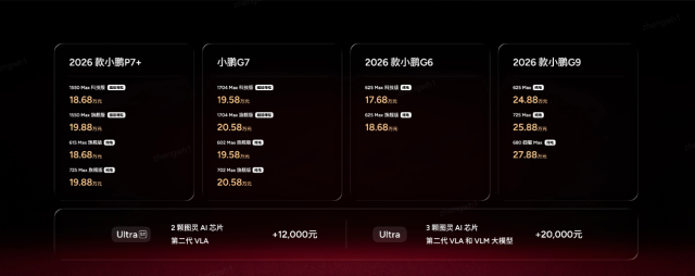 今日,在2026小鵬全球新品發布會上,小鵬汽車正式發布2026 款小鵬 P7+、小鵬 G7 超級增程、2026 款小鵬 G6、2026 款小鵬 G9。其中2026款小鵬P7+ 全球36國同步發布,新車有超級增程和純電兩種能源形式,超級增程有1550 Max 科技版和1550 Max 旗艦版,官方指導售價為18.68萬元和19.88萬元;純電有615 Max旗艦版和725 Max 旗艦版,官方指導售價為18.68萬元和19.88萬元。2026款小鵬G7推出四個版本,超級增程1704 Max 科技版和1704 Max 旗艦版,官方指導售價為19.58萬元和20.58萬元;純電602 Max 旗艦版和702 Max 旗艦版,官方指導售價為19.58萬元和20.58萬元。2026 款小鵬 G6推出純電625 Max 科技版和625 Max 旗艦版,官方指導售價為17.68萬元和18.68萬元。2026 款小鵬 G9推出純電625Max、725 Max和680 四驅Max版,官方指導售價為24.88萬元、25.88萬元和27.88萬元。