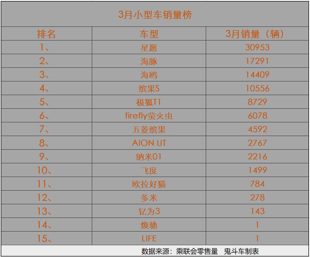 銷量就是最好的證明,日前,乘聯(lián)會(huì)發(fā)布3月車市零售銷量數(shù)據(jù),查看3月小型車銷量榜單,你會(huì)發(fā)現(xiàn),當(dāng)下的小型車市場,純電小型車幾乎是“霸榜”的狀態(tài)。接下來,我們具體聊一聊上榜車型的銷量表現(xiàn)與排名。